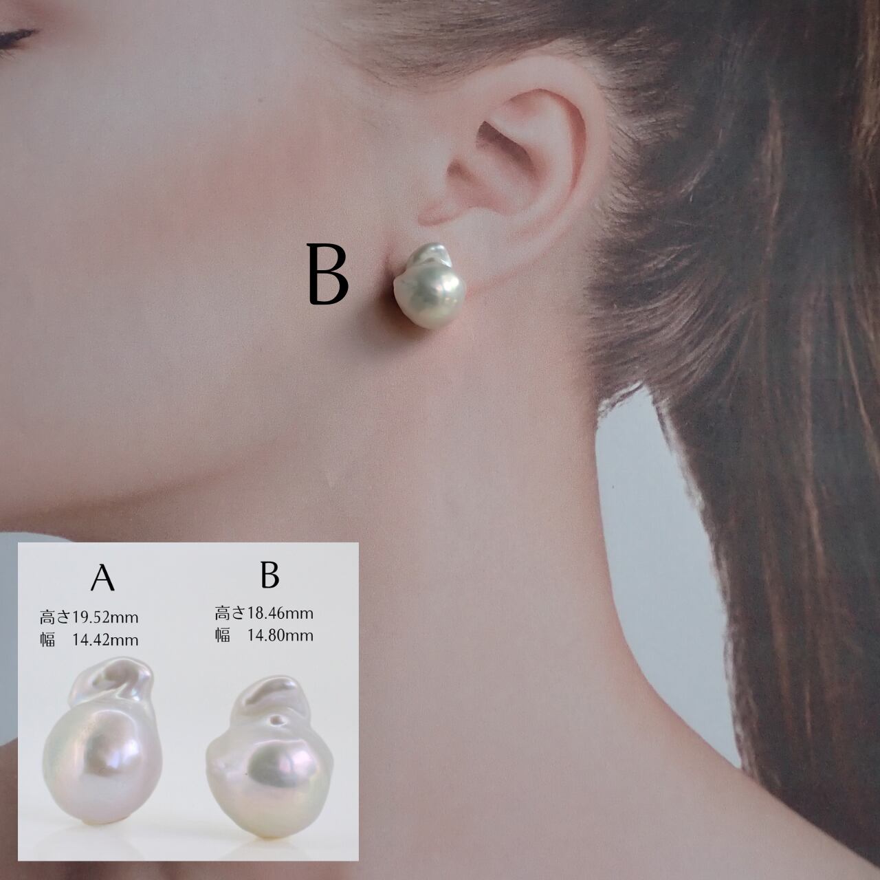 形・・・球体のバロックパールの上に短めのフェザー(羽)が生えたような形状でバランスが良い。球体は2粒とも大きさが揃っている。羽にバリがなくしなやかな状態。