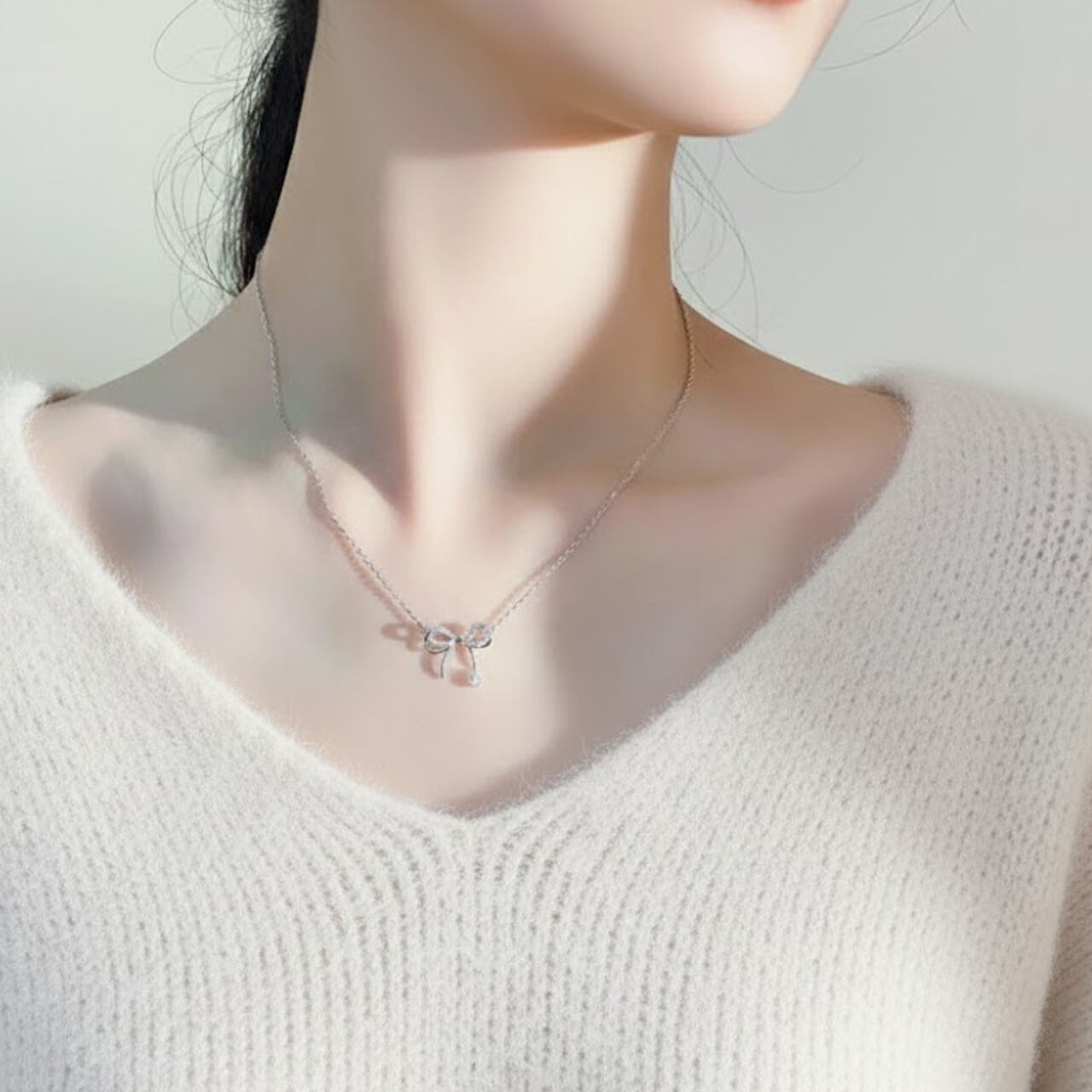 「結ばれた絆を、胸元に。可憐に揺れる一粒の光を添えた大人リボン」