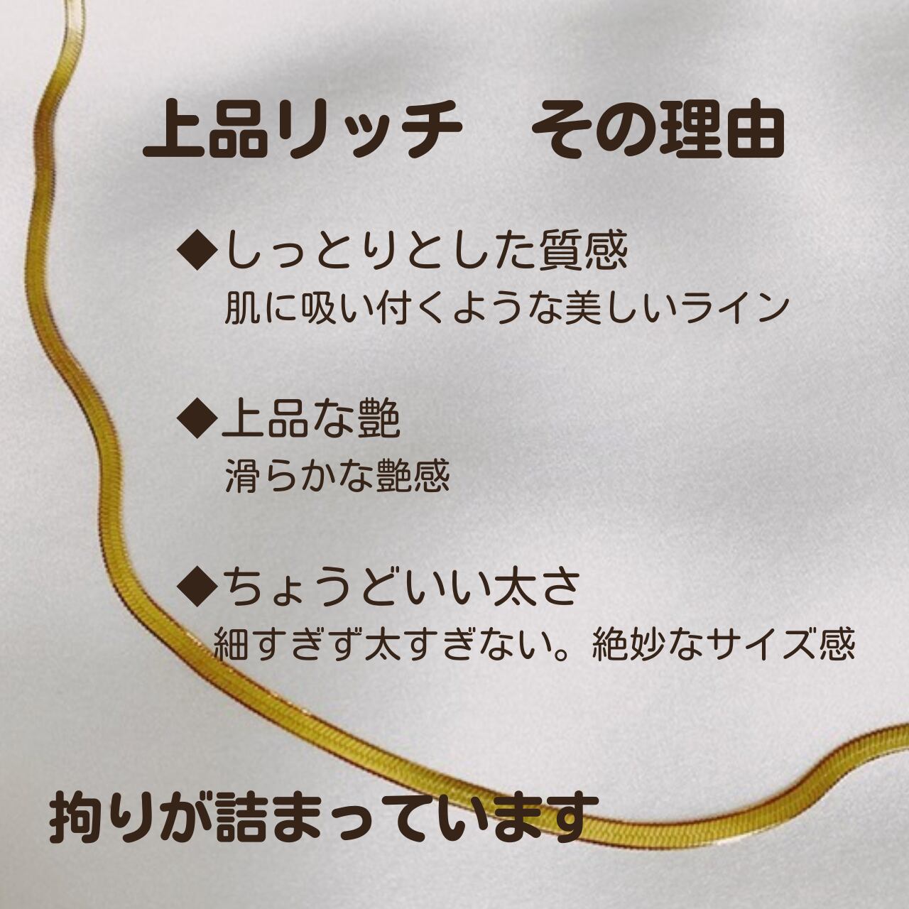 ・輝き際立つフラット仕上げ:チェーンを平たく加工することで、光を面で捉え、通常のチェーンにはない強い煌めきを放ちます。