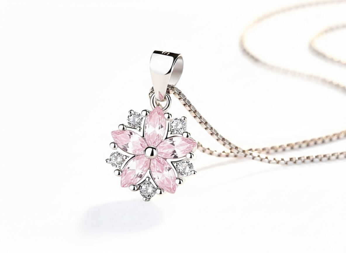 このネックレスの美しさは、花びらを表現する「ストーンの選定」と、それを一輪の花へと昇華させる「仕立ての技術」にあります。